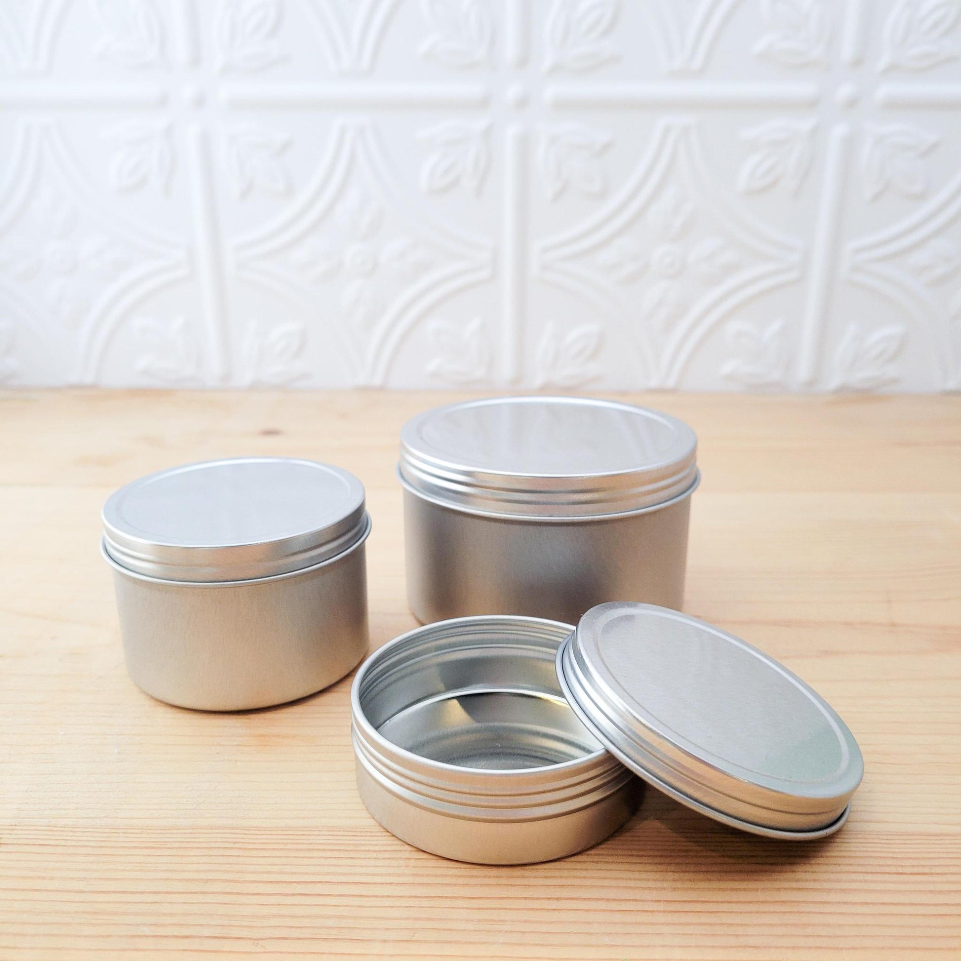 Our screw top aluminum metal tins come in a variety of sizes and are great for storage of dried products like toothpaste tablets, dried flowers, bath soak, or powders.